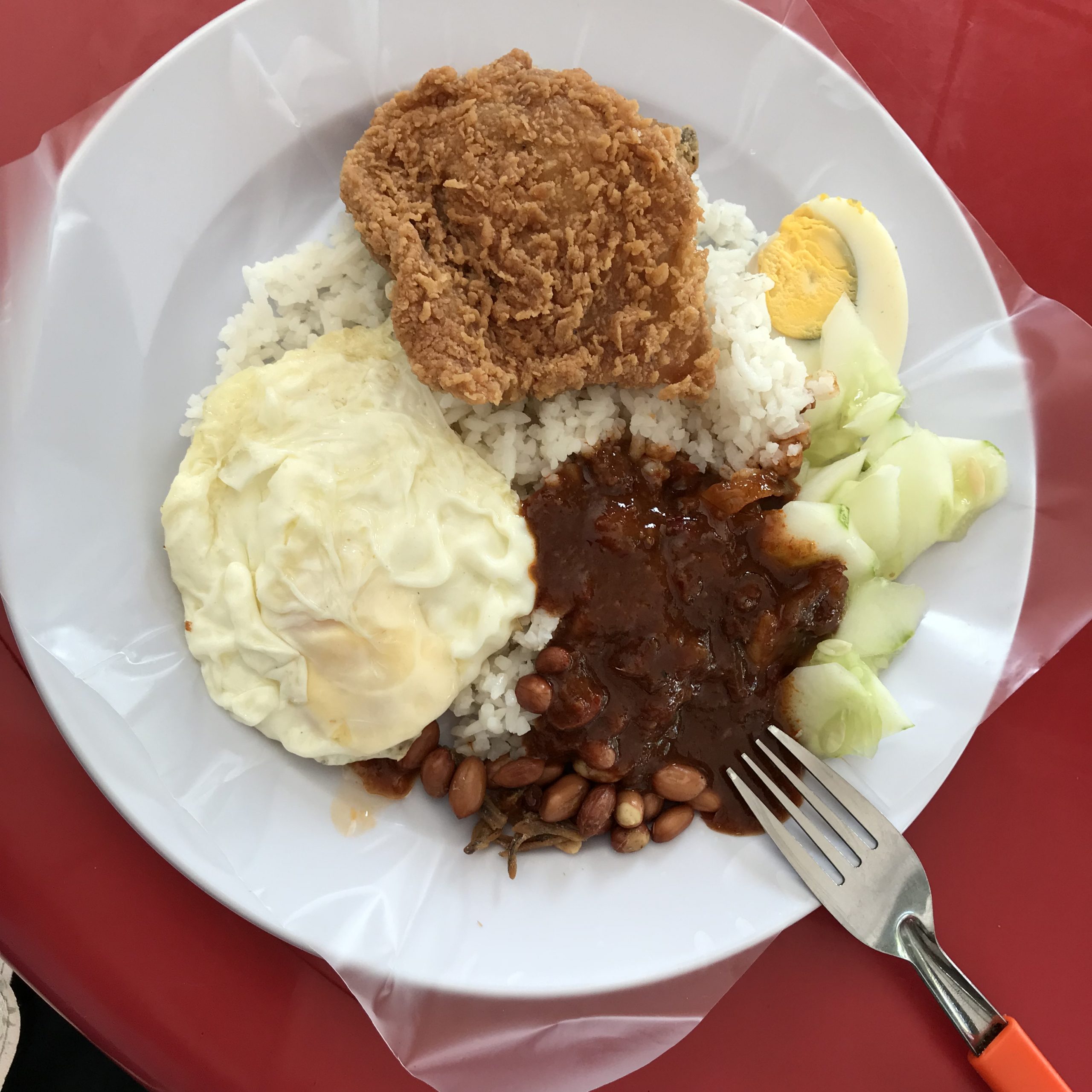 加上辣椒醬、魚乾、黃瓜片、炸雞、水煮蛋和荷包蛋,